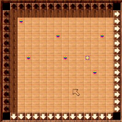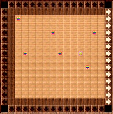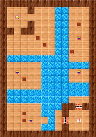 To finish this tutorial, resize your level to 14x20, and use what you have learnt to carefully (!) re-create the following level. Note that it contains Stinky, the exit with gates, water, walls, wooden boxes and rainbow coins: