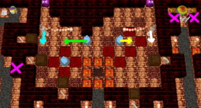 Push the two prisms along the yellow and green arrows, then the left reflector along the blue arrow, finally the right reflector along the white arrow. Purple "X"s indicate the positions of secret walls that hide Bonus Coins.