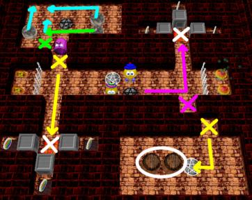 To detonate the top-right keg, position Stinky at the green "X" and use Loof to push the boulder along the green arrow. Next, push boulders along the blue paths (left first, right second, middle third). Move Stinky to the purple "X", and use Loof to push the boulder into the black teleporter. Stinky can now push the boulder into the second powder keg and detonate it.