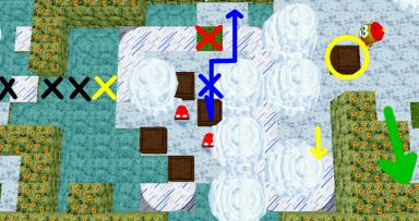 Push the yellow box along the yellow arrow to the red "X" (careful - time the spikes!) then on to the yellow "X". Stand on the yellow "X" until the chompers no longer move, then head back to the blue "X". Time the spikes and follow the blue path, quickly pushing one box down and immediately moving back up. If you time it right, you can get at least one chomper caught in the spikes. Now move back and forth leading the second chomper (if still around) into the spikes. Now remaining boxes can be used to complete the bridge to get Qookie home.