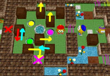 Use Qookie to push boxes along yellow arrows, then open the purple door. Use Stinky to move the box along the red arrow, and collect the bonus coins behind the fake wall. Stay at the red "X". Now move Loof into the room and to the purple "X". Switch back to Qookie and push boxes along blue arrows. Now three boxes are available to be placed on the three buttons. Collect coins and exit.