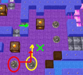 Make sure to "rescue" one steel box in the direction of the green arrow. Move it aside (e.g. to the green "X"). Drop the two wood boxes in the water, this will create four more. Drop the right and lower box in the water, use the yellow boulder to destroy the left box, then drop the top box in the water. Four more are created. Push the top box left and destroy both that and the left box using the red boulder (use the steel box as a stopper). Drop the remaining two wood boxes into the water, creating four more - two more are used for the final bridges. To get the Bonus Coins, roll one boulder into the conveyor belt and follow pushing a steel box. The boulder will activate one conveyor button, use the steel box for the other.