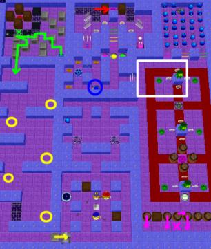 Time to get Peegue out of prison. Get Stinky, Loof, and Qookie into the main hall past the circling UFO, the electro tiles and the Zbot. At the bottom of the main hall, push three marked barrels down and then one to the side. Position one character at the purple "X" to now retrieve the box. Place the box on the white button. Collect coins in the hall. You may also wish to distribute more barrels in the white square area. The penned up Z-Bots will be released later, and a few barrels can be an effective barrier (space them at least two tiles apart, or one explosion will take out more than one barrel).