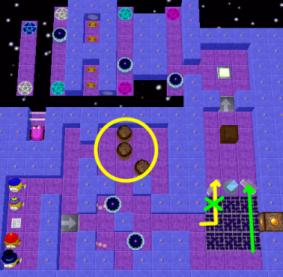 First, use Stinky to take out the two UFOs using the barrels circled in yellow. Make sure, however, that all three barrels are destroyed in the process (e.g. use one UFO to shoot one barrel first). Now use the yellow path over the grate and position yourself just below the white button. Switch to Loof and move over the green path. Dump the Prism into the water at the green "x". Prepare to dump the left reflector into the same spot, but don't do it yet. Switch back to Stinky. Time the cannon behind the white gate and open the gate after a shot has been fired. Wait until the next shot passes the first generator above it, then quickly switch to Loof and dump the reflector in the water. The generators will now create a path for fireballs to destroy the remaining UFOs. Use the wood box to complete a bridge over the water for Qookie and Peegue. Move Stinky through the teleporters (Loof can follow and collect Bonus coins by having Stinky block the teleporter exits).