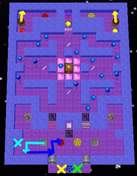 Move Stinky into the blue teleporter (to the yellow "X"), switch to Loof and move Loof into the teleporter (to the green "X"). Switch back to Stinky, enter the red/yellow teleporters and push the two barrels one step up. Now push the left steel box along the light blue path and stay at the light blue "X". Switch to Qookie! Move Qookie through the blue teleporter and push down the left boulder. Have Stinky push the steel box along the first part of the blue path. Switch to Peegue, and have Peegue step through the blue teleporter and onto the conveyor belt. This will move the box one step up and will allow you to push it into the red teleporter. Now roll the left boulder into the red teleporter, destroying the left barrel. Repeat on the right side, using Loof (who's still on the green "X") to do the equivalent of Peegue's job.