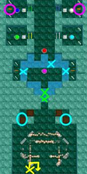 Now use Stinky, Loof, Qookie, and Peegue to press down all required buttons to reach the rainbow coins at the top of the level. You'll also need the two remaining reflectors and the boulder. To get the boulder onto one of the buttons use a reflector to stop it at the entrance of one of the middle rooms, then a bonus coin marked in purple to stop the boulder on the button - i.e. do not collect both purple bonus coins after that time.