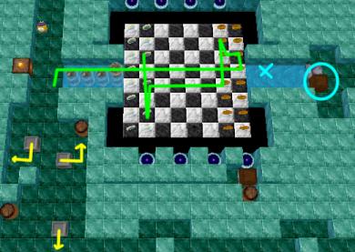 Start moving immediately and push the steel boxes along yellow paths. As soon as the final boulder for the first bridge starts rolling you need to start running along the green path - if you were too slow with the boxes the passage will be blocked by a boulder. Run along the green path collecting three of the Rainbow coins. Then wait until the boulders complete the second bridge. Once the second bridge is complete run over it and prepare to release the conveyor button (blue circle). Do so just before the next boulder arrives - roughly when it is at the blue "X". You will now have made a path for the Rainbow Spirit to collect the remaining coins. There is another conveyor button under a box behind the level exit - you can use this one to collect remaining bonus coins.