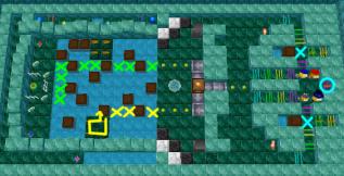 Start moving immediately (even before the level lights are fully turned on)! Get Stinky and Loof out to the left, then Qookie and Peegue to the blue "X"s. If you are fast enough, either Qookie or Peegue will have enough time to collect the bonus coin in blue. You will need to build a bridge along the green "X"s, using nine boxes. Push the boxes left of Qookie/Peegue into the water to activate the box generator. Let Stinky drop boxes into the water on the left, let Loof collect the fourth box and destroy it in one of the flames. This will generate another new set of boxes. Repeat, destroy the box again, and use the third set of three boxes to complete the green bridge.