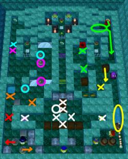 Finally, switch to Stinky. Enter each side via the conveyor and exit via the bridge to do some initial re-arrangement of the boxes - get the seven boxes into position marked by white "X"s, then position Stinky at the white circle. Now walk RR,U,L,D,LL,DD,RRR,U,RR,D,L,D, L,U,LLL,UU,RR,U,RR,DD,R,D,LLLL,