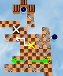 The trouble comes at the very end of this level. Immediately move the reflector left along the green arrow, then exit the teleporter again. Wait a moment for fireballs to go away, then enter again and move to the yellow "X" safe spot. Run quickly along the white path, wait just a moment for the fireballs to pass, then walk up one step to the white "X". Now run counter-clockwise around the level. But don't wait up... a fireball will be just behind you!
