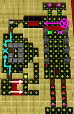 Now move (quickly) to the purple "x" at the edge of the level. Wait there until Chomper follows you onto the purple button. Now move left and have Chomper follow you onto the green button. This will activate the cannons, which will pick off chompers and boxes, allowing you to exit the level through the red teleporter.