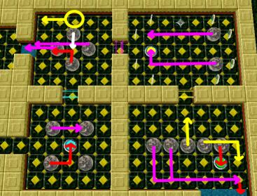 In the second room, build a bridge using the two boulders along the purple path. Then activate the purple button by pushing the boulder along the red path. To collect the bonus coins later, you'll need to also move the top boulder along the yellow path followed by the next lower boulder along the white path. This will re-close the blue door, and hence disable the cannon guarding the Bonus Coins.