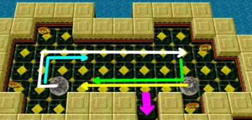 To open the purple gate, enter the top room, but do not collect the bonus coins yet. Move the right boulder along the yellow arrow, then the left boulder around the level along the the white and green path. Now mve the other boulder along the blue path. Repeat this pattern until a boulder is above the exit path, and can be pushed along the purple arrow onto the purple gate button.
