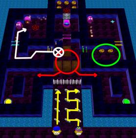 Move Stinky straight up the bridge, switch to Loof and zig zag to collect the remaining coins. The gate to the haunted castle will open. Move Loof to the green button and use it to trap the Kaboom! inside the room marked with a green circle. Be sure not to destroy the Kaboom!