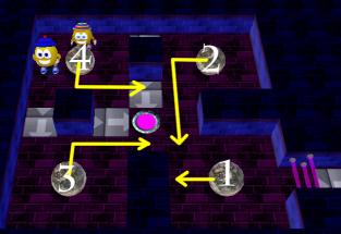 The first part of this level requires you to roll four Boulders to activate the purple button (and keep it active). To do so, roll them in the direction and order indicated above.