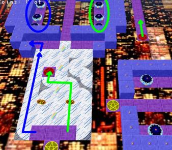 Move Stinky left (carefully time your steps with the guarding Flying Saucers). Enter the ice along the green path first. This will destroy the Saucers marked in green. Exit and re-enter along the blue path. This will destroy all but one Saucer marked in blue. You can now move up the central path and retrieve your boxes... just be careful to once again time your steps with Flying Saucers.
