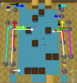 There are several solutions, but most do not allow you to collect all of the Bonus coins. To get a perfect score, move boulders along coloured arrows in the following order: