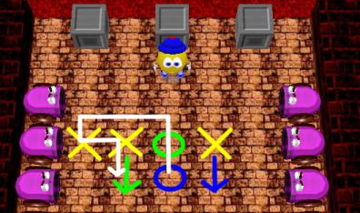 To do so, build a bridge to the north and get three steel boxes into position at the yellow "X"s. Then push the box along the green arrow (just one step), and move to the green circle. Push the box along the blue arrow, and move to the blue circle. Now wait until a fireball has passed and move along the white path. Repeat this process until you are at the bottom.