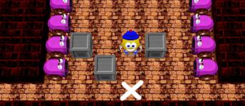 Once you are at the above position, you have several choices. To just complete the level, run to the white spot and back several times to get the Flying Saucers to destroy each other. One might survive, but you can then use the central box as a shield, pushing it down and then toward the Flying Saucer. Collect the Rainbow Coins, and return to the safe spot between the two steel boxes. Wait until a fireball passes, and make a run for the exit.