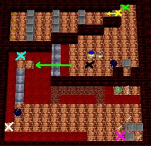 Move the steel box one step left along the yellow arrow. Then, using both Stinky and Loof to retrieve the second box below, trap and explode the Kaboom! at the yellow "X". Retrieve seven steel boxes from the stacks by positioning Loof at the green "X" and having Stinky push boxes in front of Loof. The first six can be dumped into the Lava along the green arrow - make sure you do not step onto the conveyor belt yourself though! Get the seventh box out of the room and into position at the black "X", but don't push it onto the conveyor belt yet. Move Stinky to the light blue "X" first, then have Loof push to box in. Now push the box south and move Stinky to the white "X". Have Loof deposited the box in front of Stinky, and then get to a safe spot on the bridge. Use the box to trap and explode the Kaboom! at the purple "X" (you'll need to Rainbow coins for that - don't collect them first!), and exit the level.