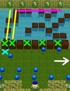 Your goal is to avoid the Z-Bot traffic, then build a bridge along the two yellow paths. To do so, dump the boxes marked with green "X"s into the water, and use the remainder. By pushing on of these boxes into traffic (at the blue "X"), you can create quite a show! This will also clear enough traffic to allow you to explore the right edge of the level (white arrow) where more boxes are hidden. Once the two yellow paths are complete, start building along the purple path and collect your coins.