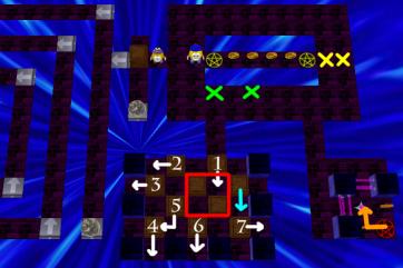 Phew! Now help Stinky get the last box out of that room and onto the left green "X". Move Stinky into the left yellow teleporter to collect the bonus coins. Stay to the very left of the interior strip, and have Loof push in one of the boxes. Switch to Stinky and move the box one field left (by going into the teleporter again), then have Loof push in the second box. The teleporter is now disabled, and both Stinky and Loof can exit.