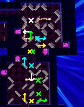 Switch immediately to Loof. In the first room, push the reflector one step along the yellow arrow and get to the yellow safespot "X". Then push along the right green arrow, and move (one by one) to the two green safe spots. Push up along the blue arrow and get to the blue "X" safe spot. Finally, pushing the reflector down along the white arrow will make it easier for Stinky to follow your path later.
